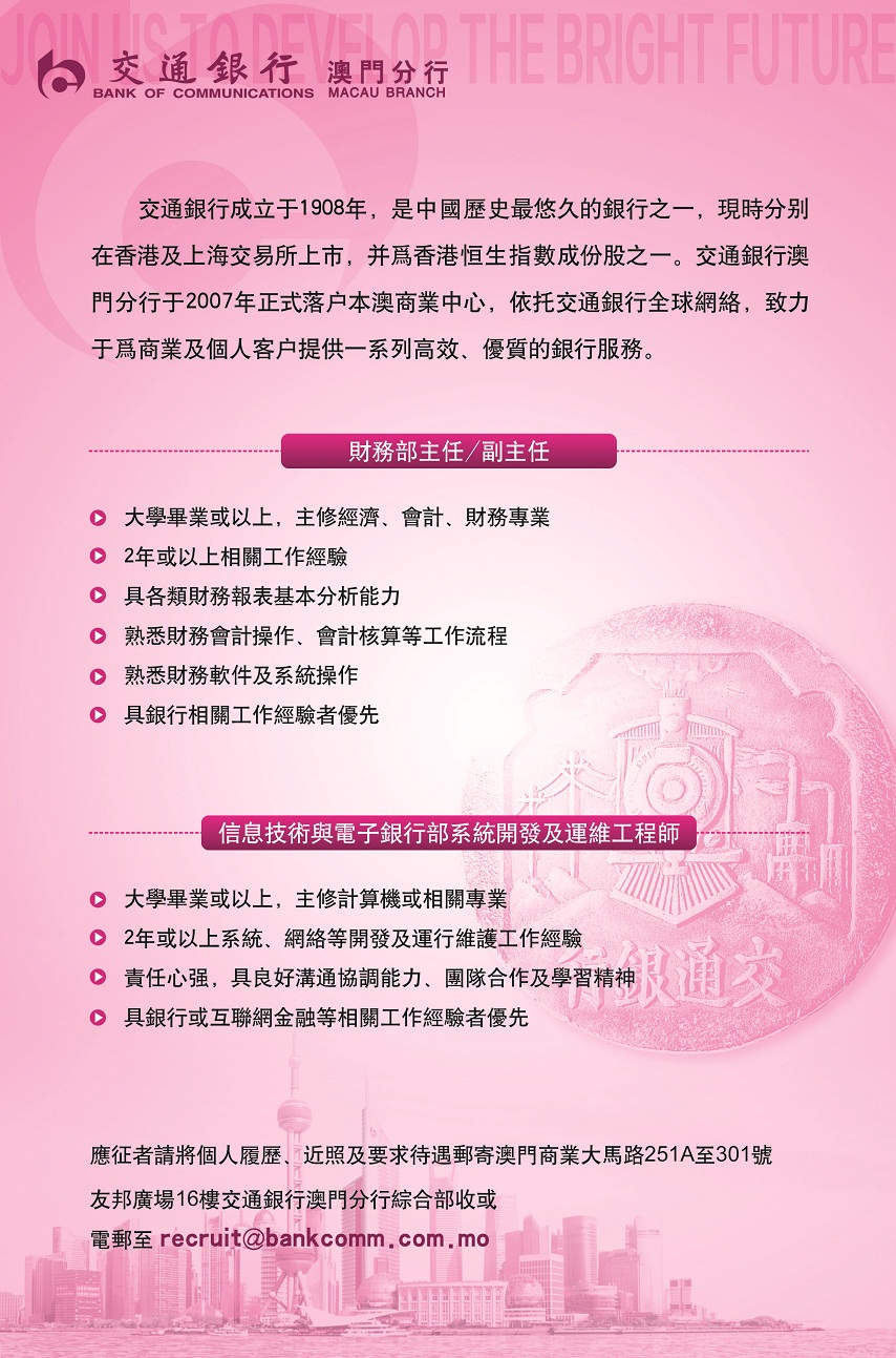 应征方法:请将个人履历、近照及要求待遇邮寄交通银行澳门分行综合部或电邮至: recruit@bankcomm.com.mo 。